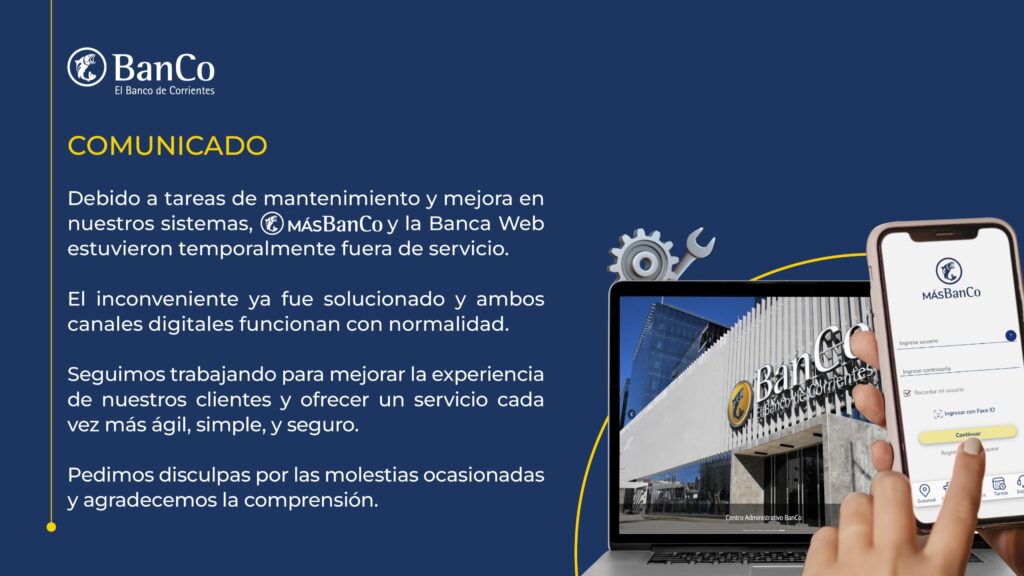El Banco de Corrientes comunica a sus clientes y a la comunidad que, en el marco de tareas de mantenimiento y mejora continua en sus sistemas, entre este martes y miércoles se produjo un desperfecto técnico que afectó temporalmente el funcionamiento de la aplicación MÁSBanCo y de la Banca Web.