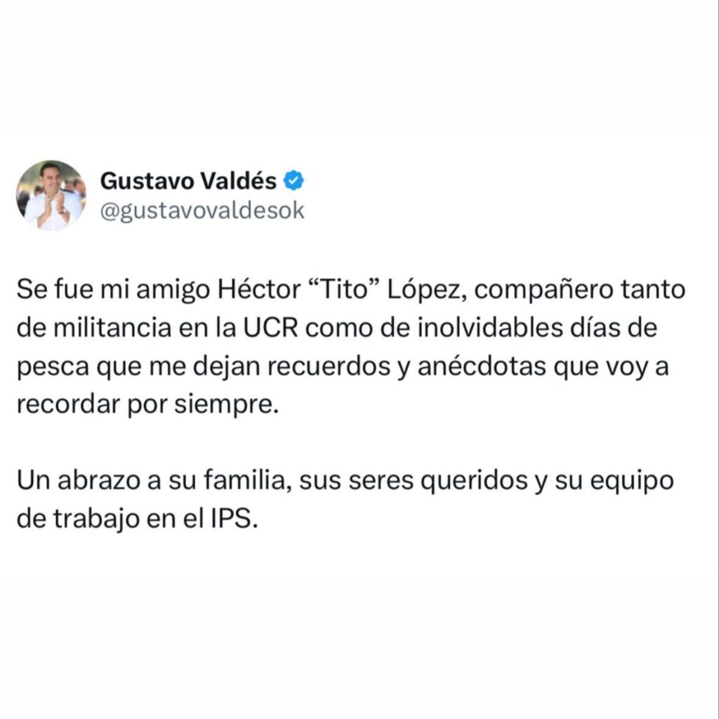 “Se fue mi amigo Héctor “Tito” López, compañero tanto de militancia en la UCR como de inolvidables días de pesca que me dejan recuerdos y anécdotas que voy a recordar por siempre”, transmitió el mandatario.