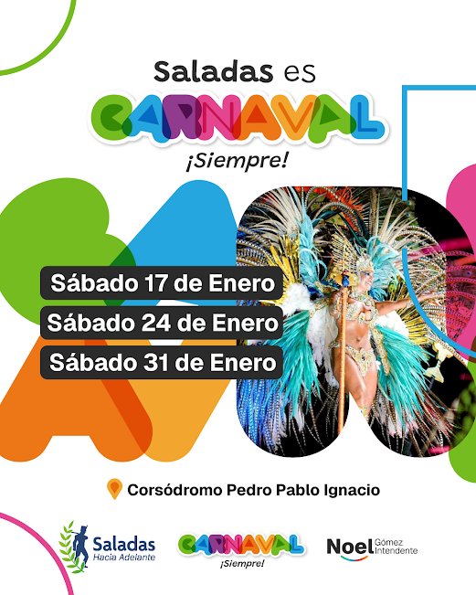 La ciudad de Saladas ya palpita una nueva edición de su máxima fiesta popular. Este sábado 17 de enero comienza el Corso Oficial, que continuará los sábados 24 y 31 de enero, a partir de las 22 horas, en el corsódromo Pedro Pablo Ignacio, ubicado en el Complejo Turístico Municipal.